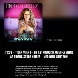 Jeg taler med Mannah Guldager om tidens store kriser. Klima, corona og Ukraine. Hvad sker der, hvad kan vi selv gøre, og kan mørket være tjener for lyset? Vi foretager en astrologisk overflyvning af de senere år og tager et kig på Putins og Zelenskyys horoskoper.